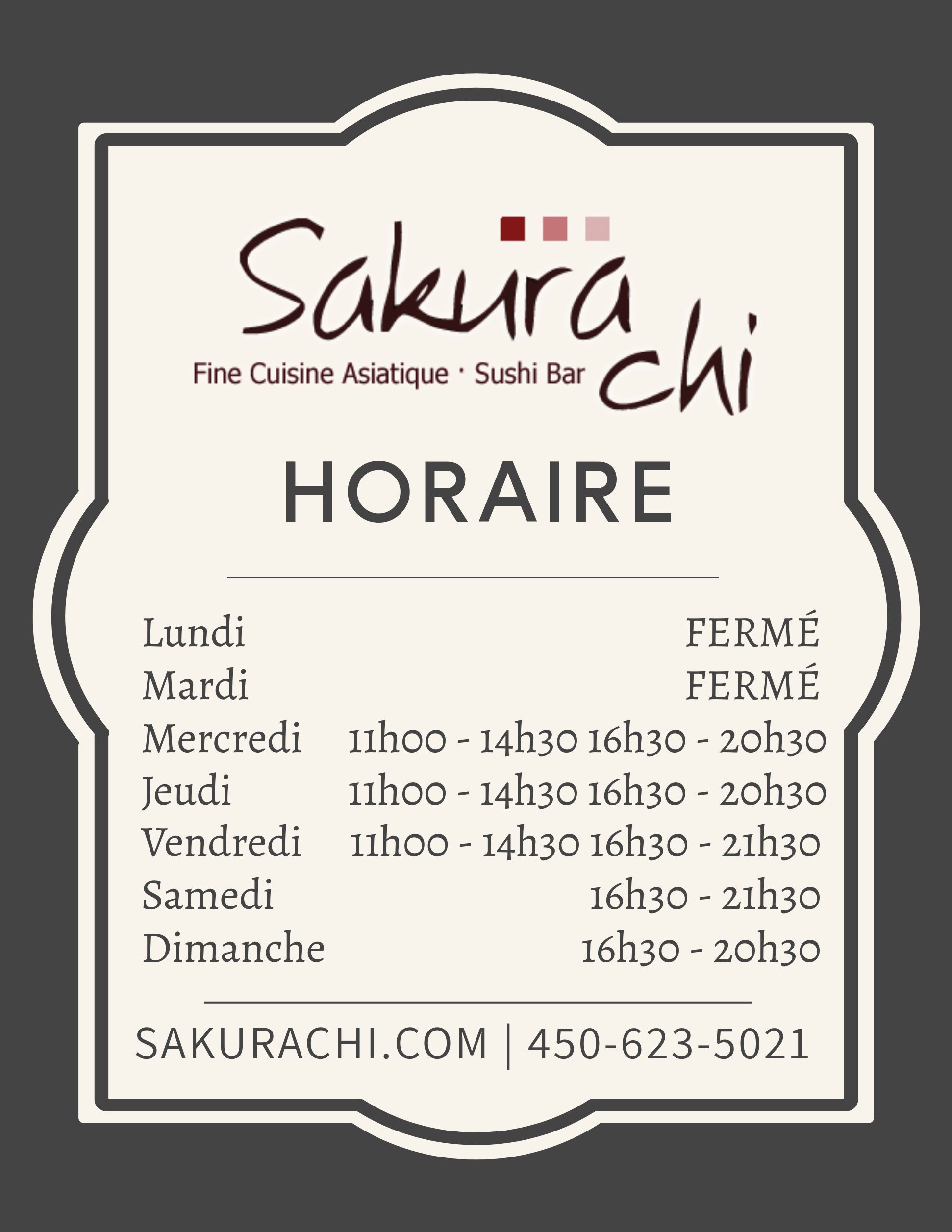 Sakura Chi est un restaurant convivial qui vous transporte dans un décor chic et moderne ou vous pouvez apporter votre vin. Avec un style décontracté et élégant, ce restaurant, situé à St-Eustache sur la rive-nord de Montréal, saura vous charmer. Découvrez de délicieux mets asiatiques tel que des sushis, des grillades, des plats sautés et une variété de teriyaki, le tout dans une formule ¨Apportez votre vin¨. Toute l'équipe du Restaurant Sakura Chi vous invite pour venir découvrir notre gastronomie asiatique des plus raffinés, que ce soit en salle à manger ou pour emporter.